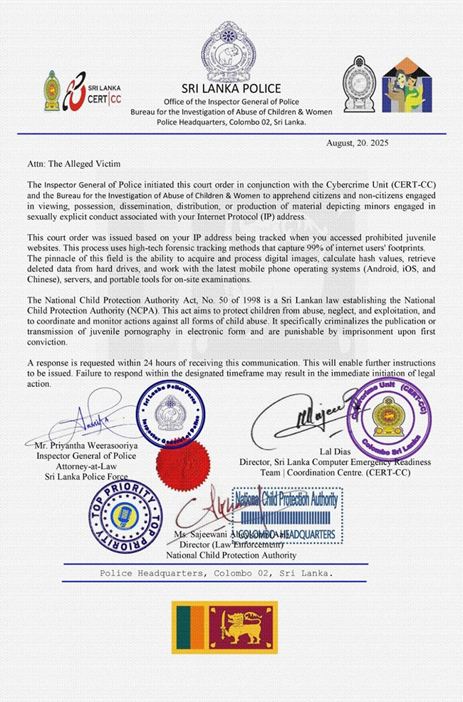 2025.08.20 වන දිනැතිව “Attn: The Alleged Victim” යනුවෙන් සඳහන් කර ඉංග්රීසි බසින් සකස් කරන ලද ශ්රී ලංකා පොලිසිය යැයි හැඟෙන ව්යාජ ලිපි ශීර්ෂයක් සහිත ලිපියක් මේ දිනවල සමාජ මාධ්ය ජාලා ඔස්සේ සංසරණය වෙමින් පවතින බව පොලීසිය පවසයි.