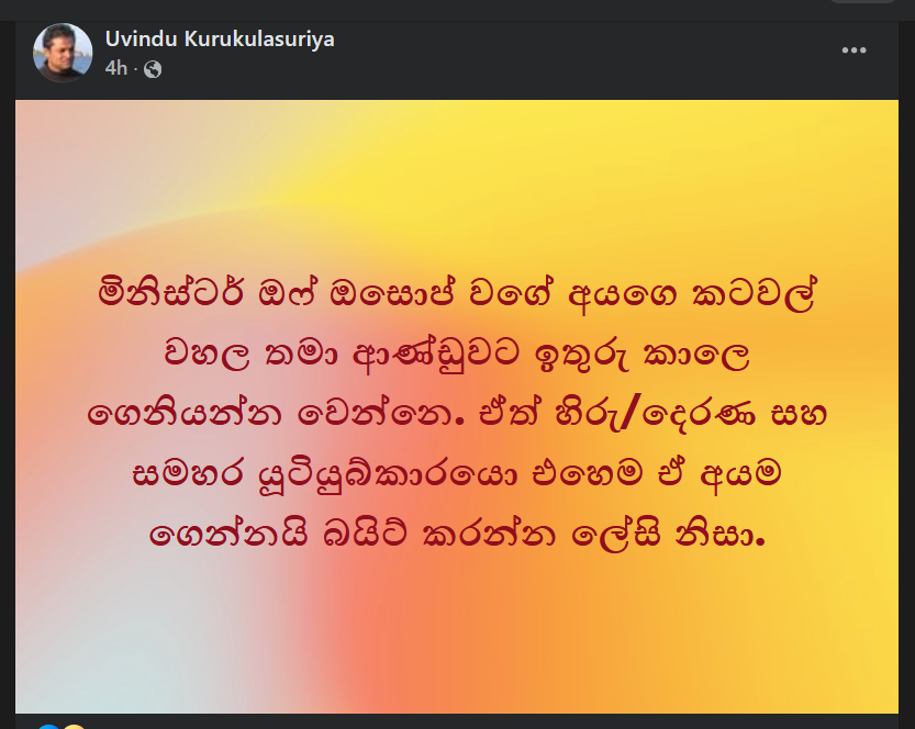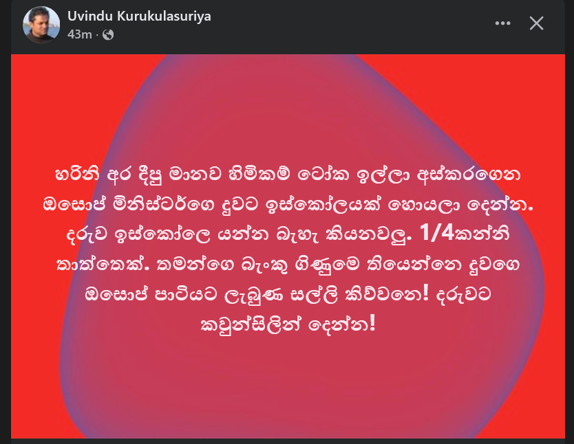 තම දියණියගේ ඔසප් සාදයේ මුදල් බැංකු ගිණුමට දාගත් අමතිවරයාගේ දියණියට අලූත් පාසලක් හොයා දෙන්නයි ඉල්ලා සිටින බව එංගලන්තයේ සිටින මාධ්‍යවේදී උවිඳු කුරුකුරුසූරිය මහතා ඉල්ලයි.
