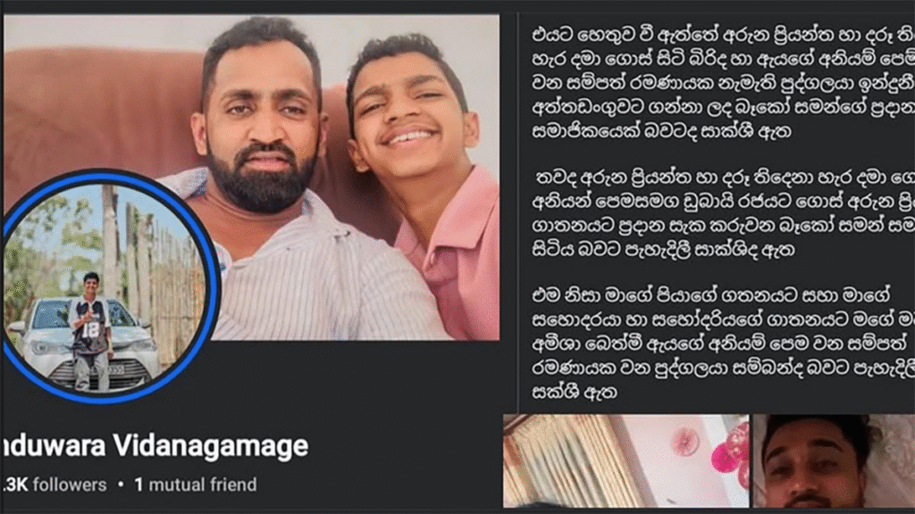 අරුණ විදානගමගේ ගේ පුත්‍රයා අද පස්වරුවේ ප්‍රවෘත්ති සාකච්ඡාවක් ද පවත්වා අදහස් පළ කළ අතර එහිදී, සිය පියාගේ මරණයෙන් පසු තම මවගේ ගිණුමට බැර වූ බව කියන මුදලක් පිළිබඳව ද ඔහු අනාවරණයක් කළේය.