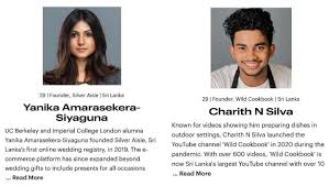 කාණ්ඩ කීපයක් යටතේ ෆෝබ්ස් සඟරාව ආසියාවේ වයස අවුරුදු 30 ට අඩු විශිෂ්ඨයන් 30 දෙනා තෝරාගනු ලබන අතර 29 හැවිරිදි යානිකා අමරසේකර රිටේල් ඇන්ඩ් ඊකොමස් කාණ්ඩයෙන් විශිෂ්ඨයන් 30 දෙනා අතරට තේරී ඇත. එසේම 29 හැවිරිදි චරිත් එන් සිල්වා ආර්ට්ස් කාණ්ඩයෙන් සහ 25 හැවිරිදි නිකින් මාතරආරච්චි සමාජ මාධ්ය, අලෙවිකරණය හා දැන්වීම් ප්රචාරණය කාණ්ඩයෙන් ෆෝබ්ස් සඟරාවේ විශිෂ්ඨයන් 30 දෙනා අතරට තේරී පත්විණ.