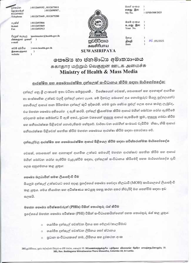 එළඹෙන වෙසක් සහ පොසොන් උත්සවය වෙනුවෙන් පවත්වනු ලබන දන්සැල් සඳහා සෞඛ්ය හා ජනමාධ්ය අමාත්යාංශය විසින් පොදු උපදෙස් මාලාවක් නිකුත් කර තිබේ.