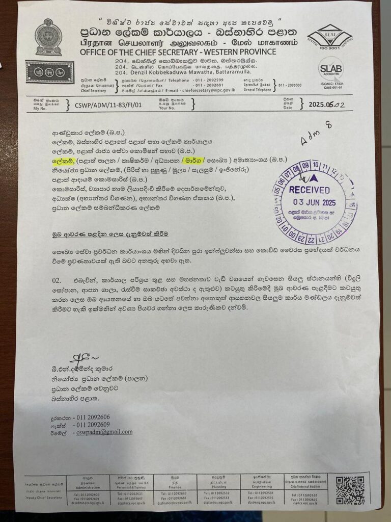 මේ බව දැනුවත් කරමින් ,බස්නාහිර පළාත් නියෝජ්ය ප්රධාන ලේකම් (පාලන) බී.එන්.දම්මින්ද කුමාර මහතාගේ අත්සනින් යුතුව බස්නාහිර පළාත් ආයතන ප්රධානීන් වෙත ලිපියක් යොමු කොට ඇත.