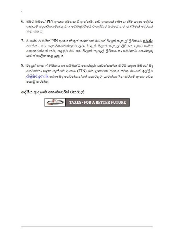 2024/2025 තක්සේරු වර්ෂය සඳහා ආදායම් වාර්තා ඉදිරිපත් කිරීම සඳහා දැනටමත් නිකුත් කර ඇති පුද්ගලික හඳුනාගැනීම් අංකය (PIN) වලංගු කාලය දීර්ඝ කිරීමට දේශීය ආදායම් බදු දෙපාර්තමේන්තුව පියවර ගෙන තිබේ.